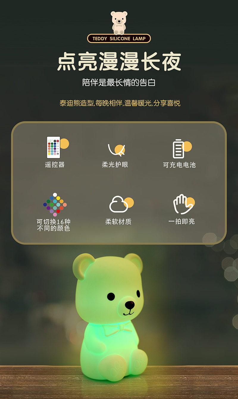 您的位置:首頁(yè) > 產(chǎn)品中心 > 硅膠家居用品 > 拍拍燈 > 泰迪熊硅膠臥室氛圍床頭伴睡小夜燈拍拍燈廠家跨境批發(fā)