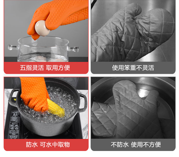 硅膠烘焙手套質(zhì)地柔軟,分指設(shè)計(jì),防滑防臟,內(nèi)置隔熱棉,有效保護(hù)雙手。